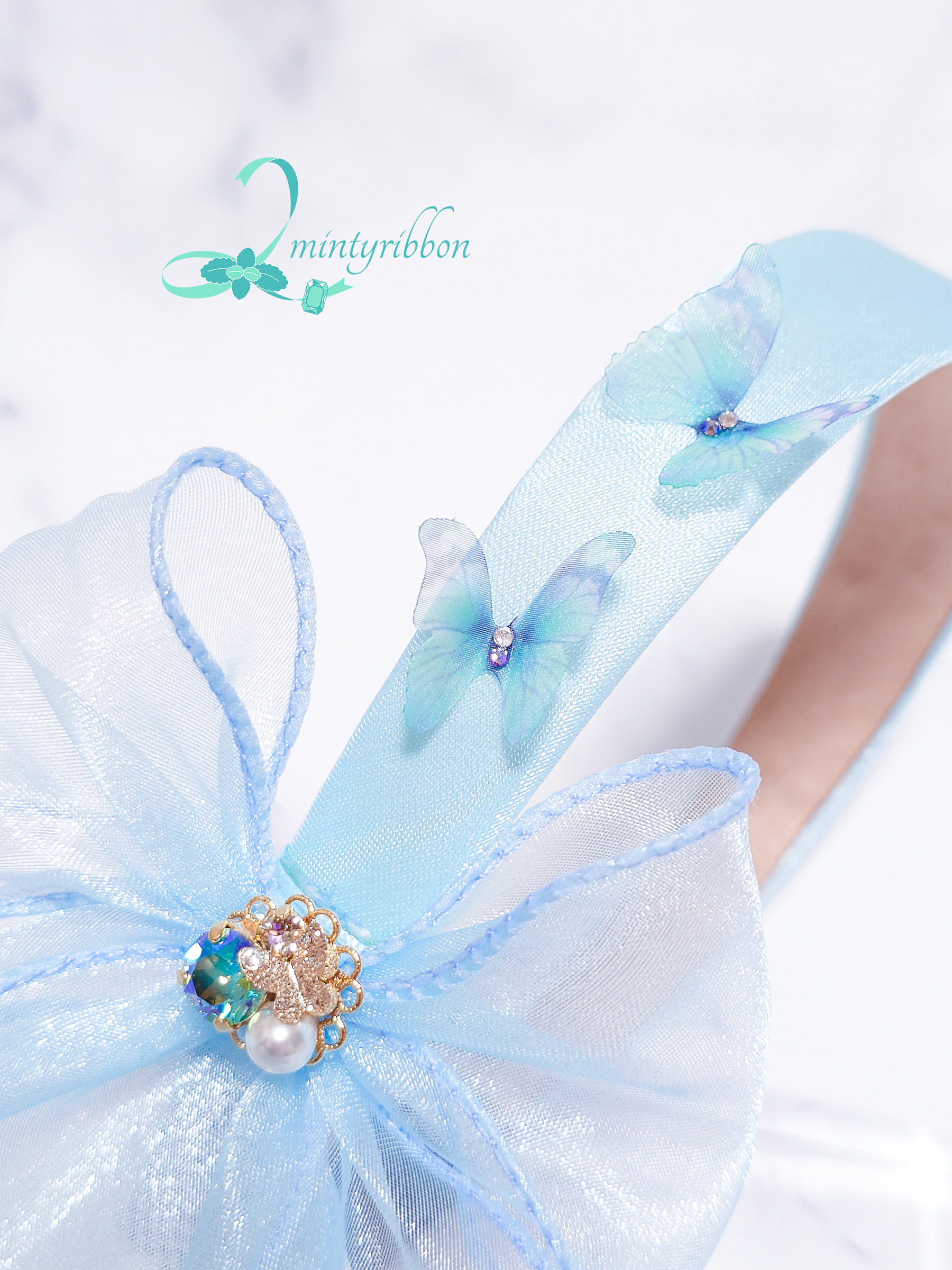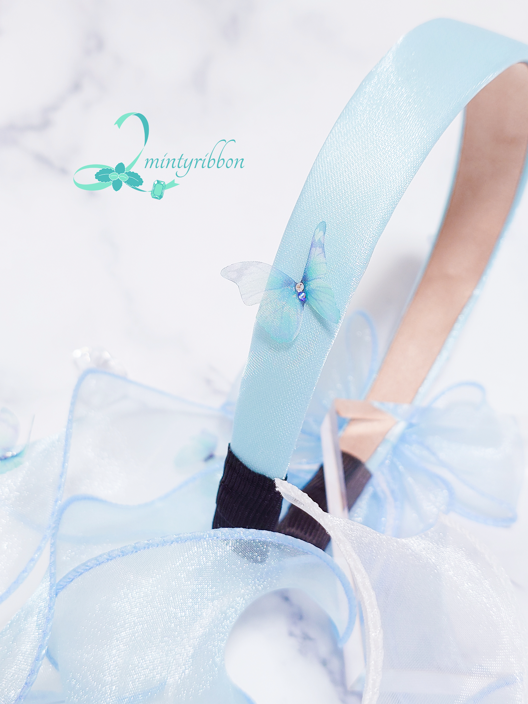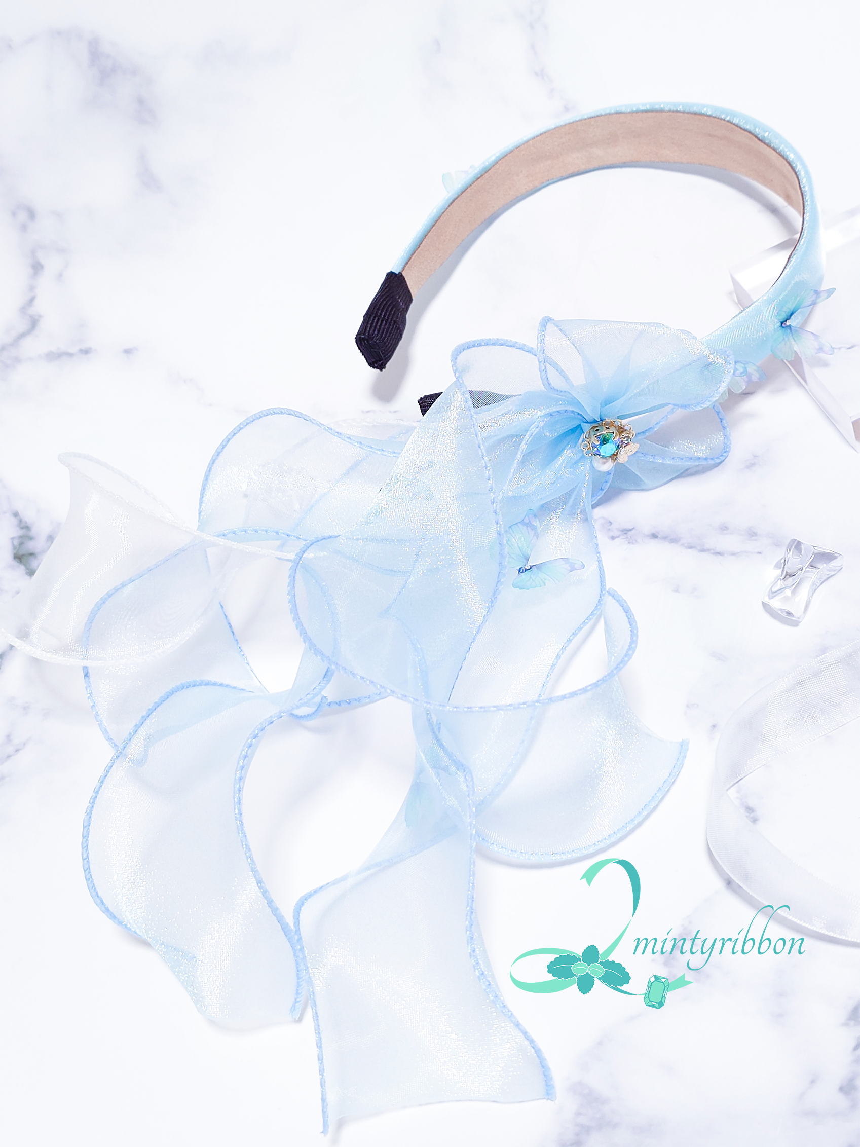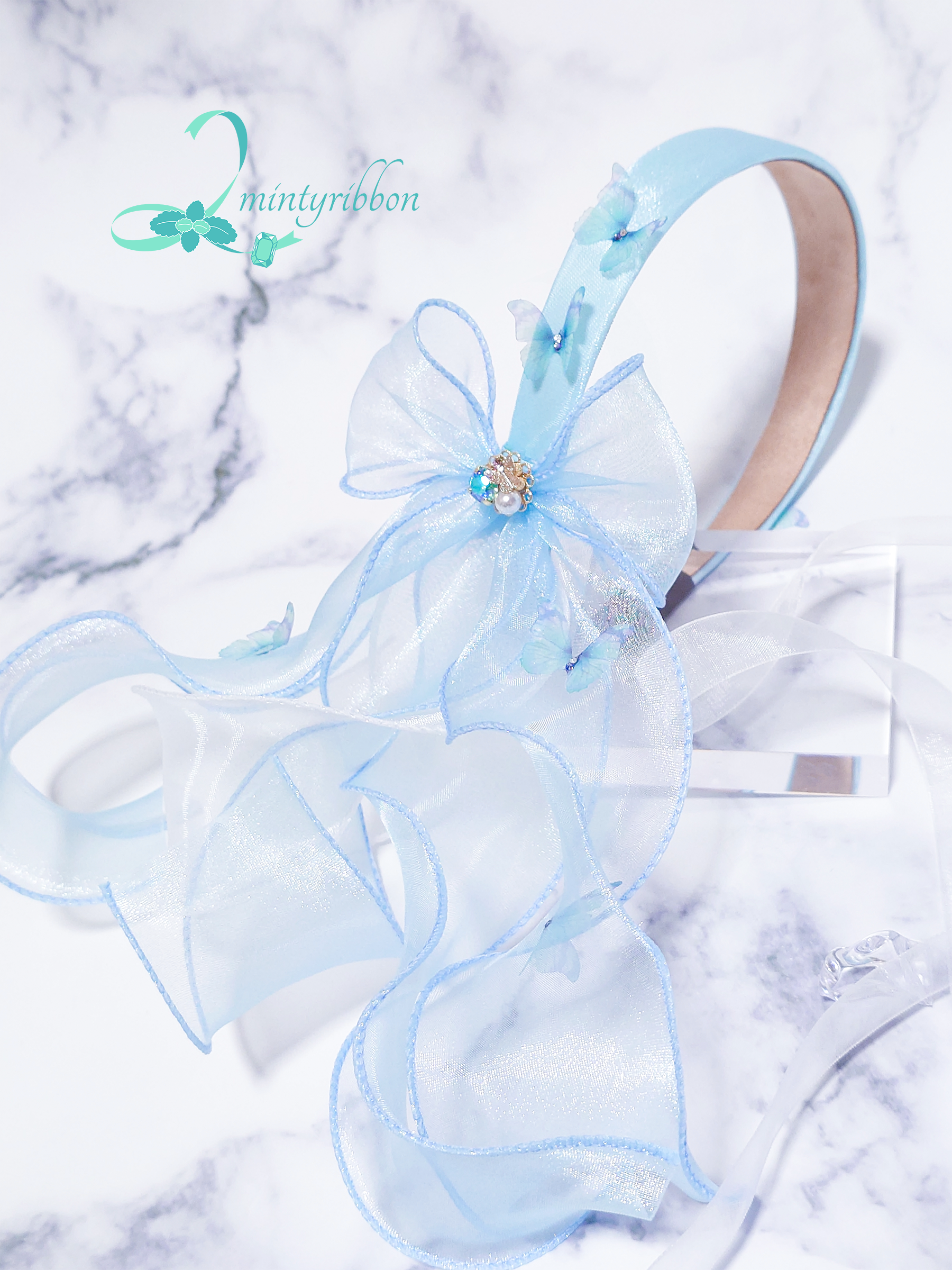 金魚と蝶の優しい出会いを、空色のヘアアクセサリーに仕立てました。